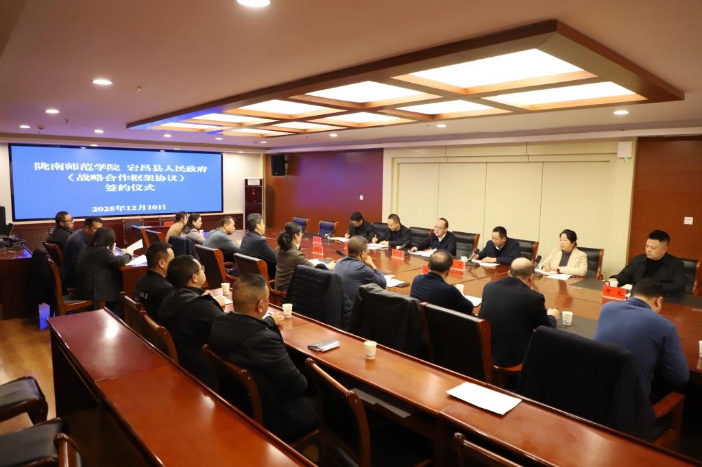 202511月27日,我校与两当县人民政府战略合作框架协议签署仪式在两当县干部学院会议室举行。学校校长李艳红,两当县委副书记、县长李海龙出席仪式。李艳红回顾了校地深厚的合作渊源,对两当县委县政府长期以来关心和支持学校发展表达了感谢。她指出,学校作为陇南唯一的本科高校,紧跟高等教育改革发展趋势,主动融入全省“四强”行动,积极对接陇南“三城五地”奋斗目标,在红色资源育人、民间艺术、山地农业、学生实习就业等方面...